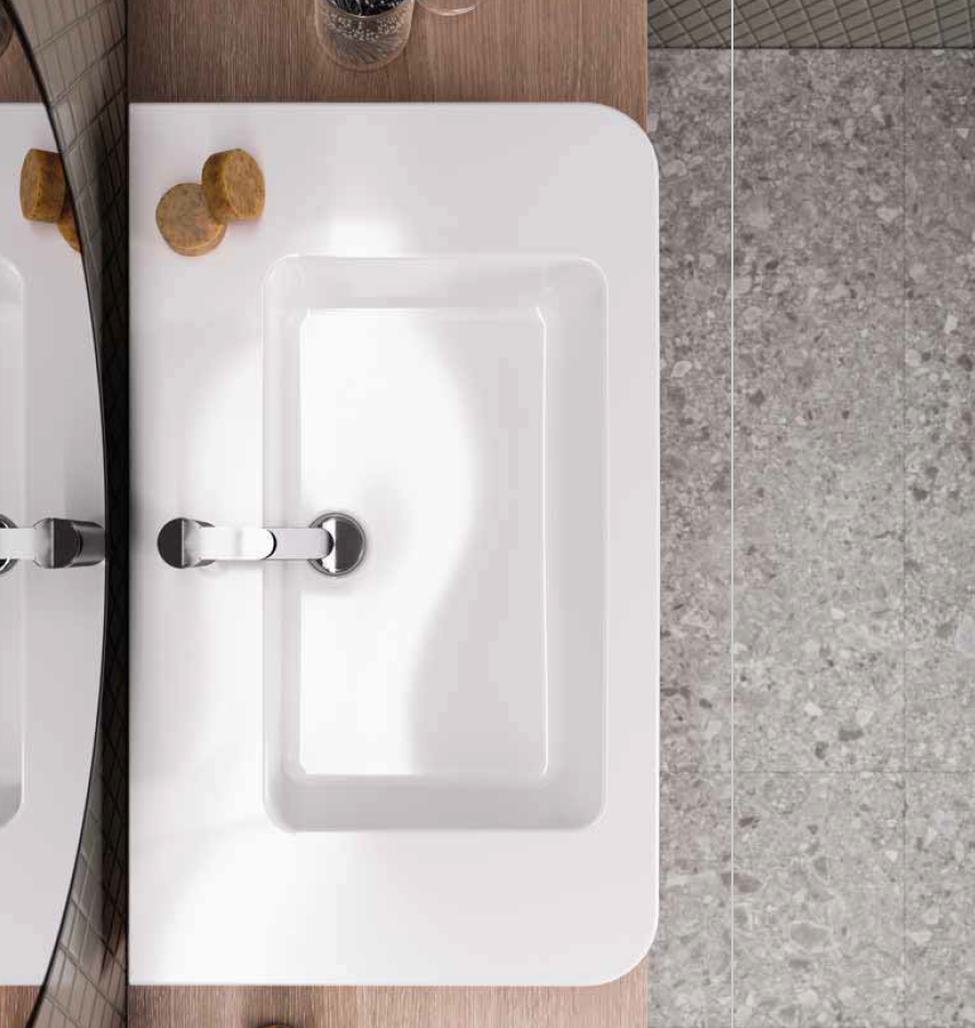 Einbauwaschbecken Velvet mit Überlauf und Hahnloch, auch geeignet für Wandmontage.