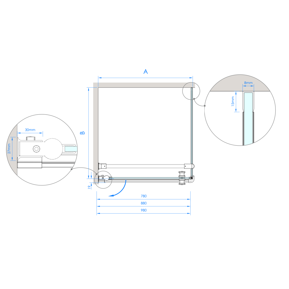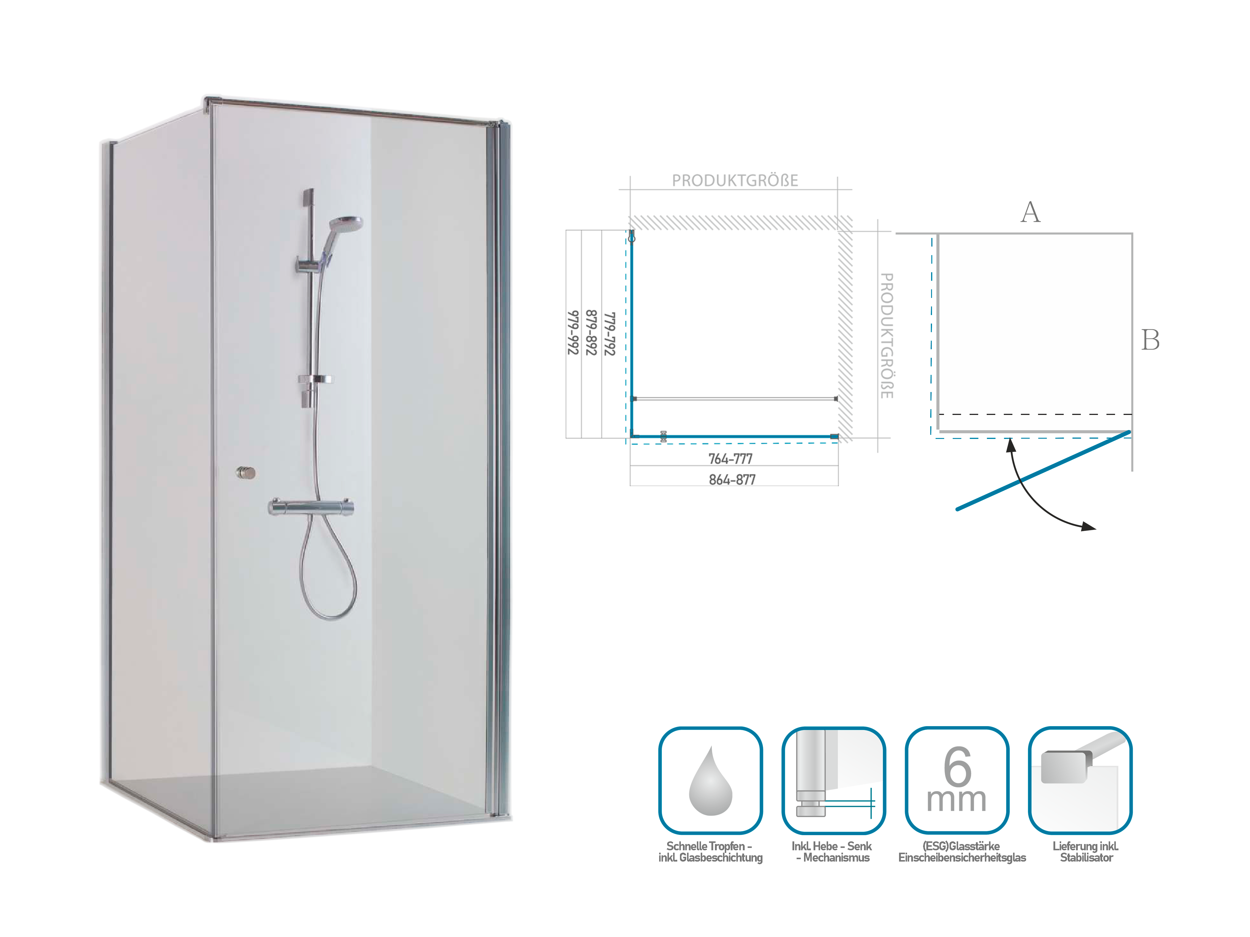 Die KRISTINA Eckdusche ist ausgestattet mit Drehtür und fester Seitenwand. Hochwertige Materialien und eine technisch ausgereifte Verarbeitung sprechen für die Eckdusche. Der Hebe-Senk-Mechanismus lässt die Tür ganz leicht öffnen und Magnetleisten verhelfen zu einem dichten Verschließen.