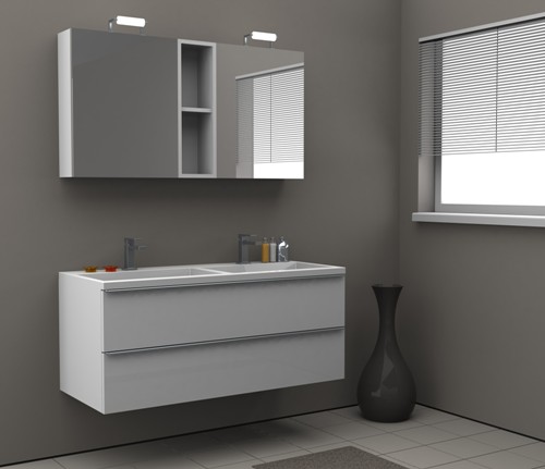 Das Badmöbel-Set überzeugt durch eine hochwertige, weiß glänzende Oberfläche.