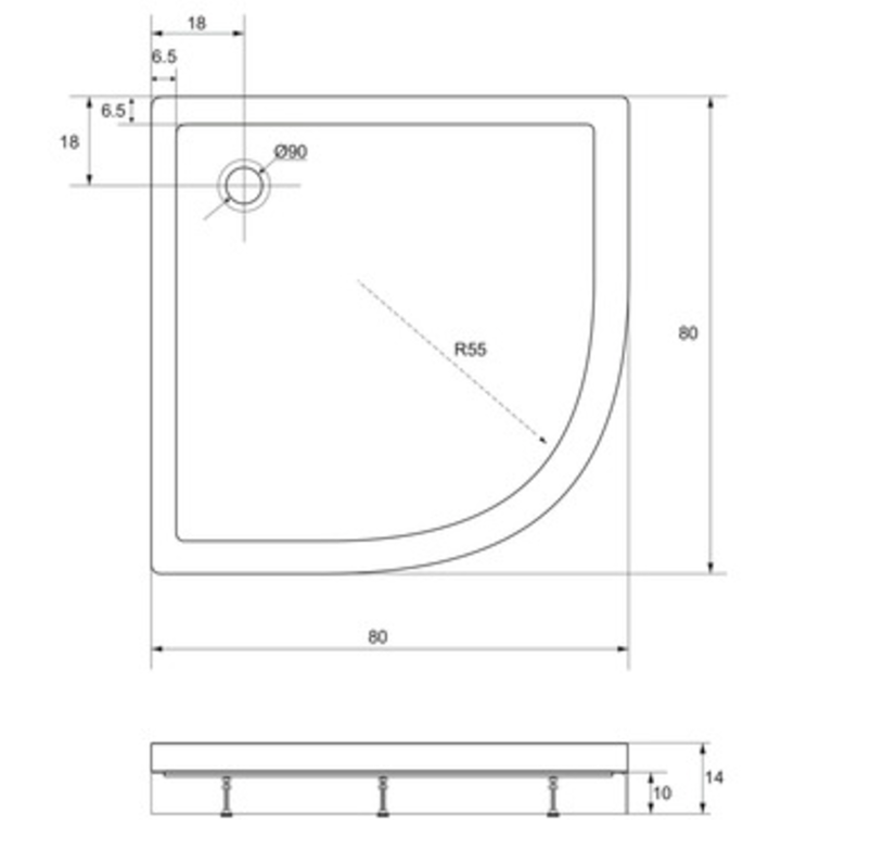 Hochwertige Duschtasse aus Sanitär-Acryl, passend für Viertelkreis - Duschabtrennungen mit einer Radius von 55 cm und einer Grundfläche von 80 x 80 cm und 90 x 90 cm.