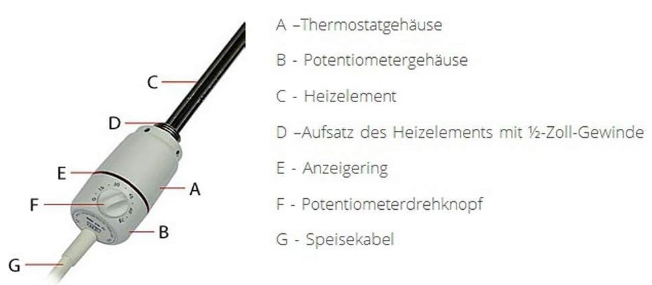 Hochwertige Komponenten für eine präzise Temperaturregelung, frei positionierbare Thermostatregelung, sichtbare Signalisierung des Heizbetriebs im gesamten Gehäuse, wasserdichte Bauweise mit verbessertem Schutz gegen Eindringen, spezielle Gummidichtung für zusätzliche Abdichtung.