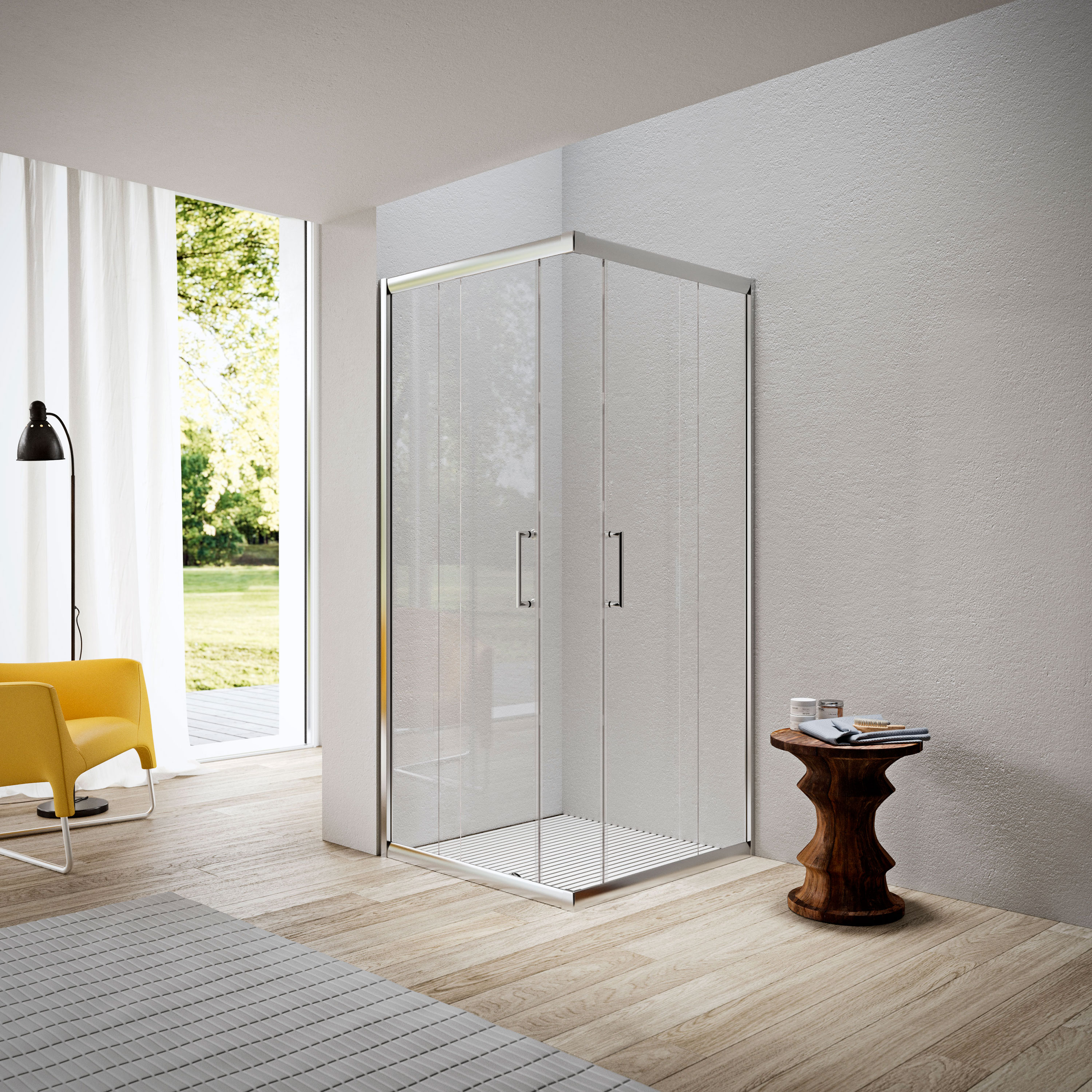 Der ISY Eckeinstieg besteht aus 6 mm starkem Einscheiben-Sicherheitsglas (ESG) und bietet damit zuverlässige Stabilität und Sicherheit. Die schlichten, dezenten Aluminium-Seitenprofile unterstreichen das minimalistische Design und ermöglichen gleichzeitig einen Wandunebenheitsausgleich von bis zu 20 mm – ideal für unterschiedliche bauliche Gegebenheiten.