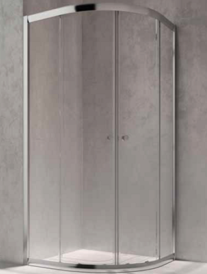 Runddusche mit Schiebetüren, 4-teilig, Radius 550mm, 800x800mm, mit 6mm ESG Sicherheitsglas, Glas satiniert, ohne Beschichtung, Schiebeelemente aushängbar, oben Doppelrolle und unten Einfachrolle, Alu-Profil Chrom.