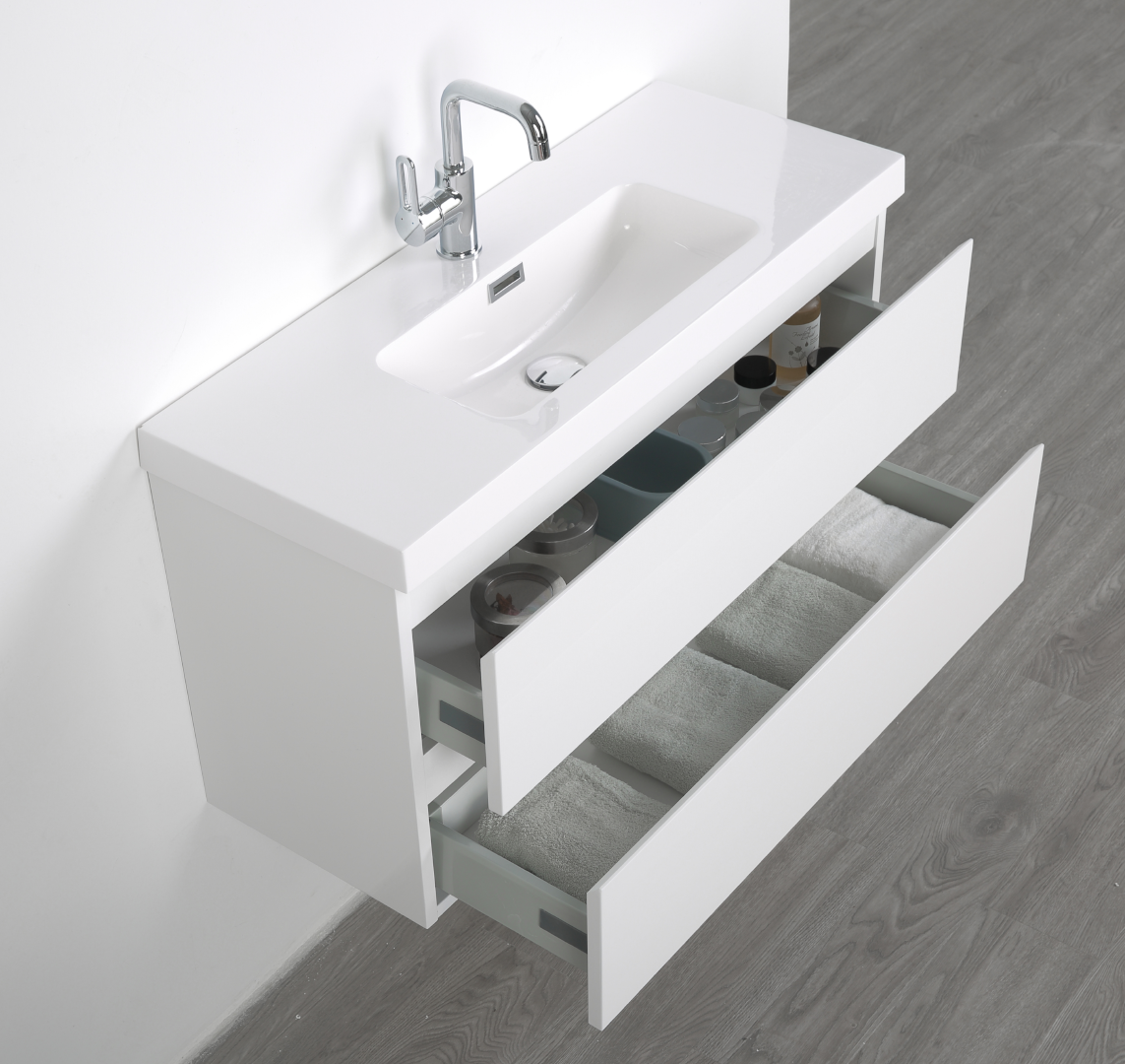 Ausgestattet mit einem hochwertigen Metall-Schubkastensystem, bietet das Badmöbel Stabilität und eine leichte Bedienbarkeit. Eine Soft-Close-Funktion sorgt dafür, dass die Schubladen sanft und geräuschlos schließen.