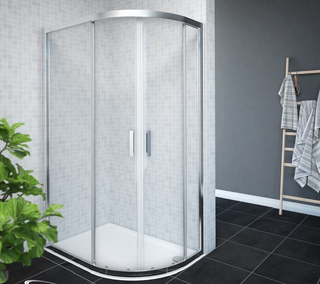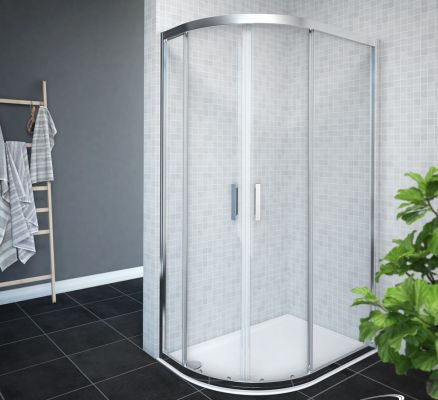 Ausführung: Asymmetrische Runddusche mit Schiebetüren, 4-teilig und reversibel montierbar. Gefertigt aus 5/6 mm starkem ESG-Sicherheitsglas in Klarausführung, kombiniert mit eleganten Aluminiumprofilen in Chromoptik.