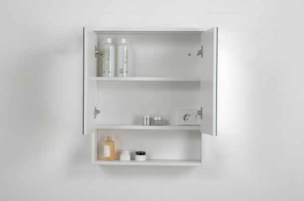 Mit zwei Spiegeltüren ohne sichtbare Griffe fügt sich der Schrank elegant und minimalistisch in die Badezimmereinrichtung ein. Der Innenraum mit einem Einlegeboden und ein integrierter offenen Ablage bieten viel Stauraum für Badutensilien und ermöglichen eine übersichtliche und geordnete Aufbewahrung.