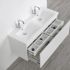 Ein echter Blickfang ist das Wellenförmige Doppel-Waschbecken. Die Schubladen verfügen über einen Vollauszug und ermöglichen Ihnen somit die maximale Nutzung des Stauraums. Zusätzlich sind die Schränke mit einer Soft-Close-Technik ausgestattet – dadurch ist ein geräuschloses Schließen der Schubkästen gegeben. Das lästige zusammenbauen des Badunterschranks entfällt, da dieser bereits vormontiert ist.