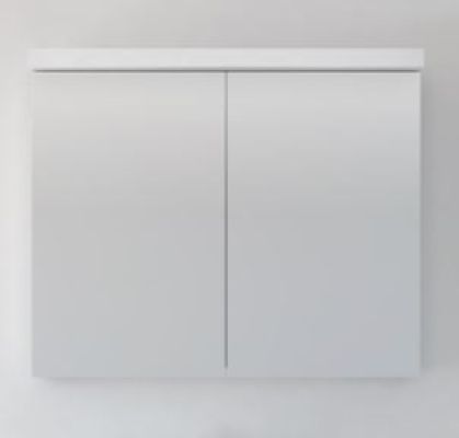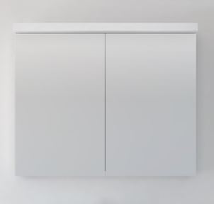 Zwei Spiegeltüren ohne sichtbare Griffe verleihen dem Schrank ein modernes, minimalistisches Erscheinungsbild und integrieren sich harmonisch in die Badezimmereinrichtung. Im Inneren sorgen zwei Einlegeböden für viel Stauraum, damit Badutensilien übersichtlich ordentlich verstaut sind.