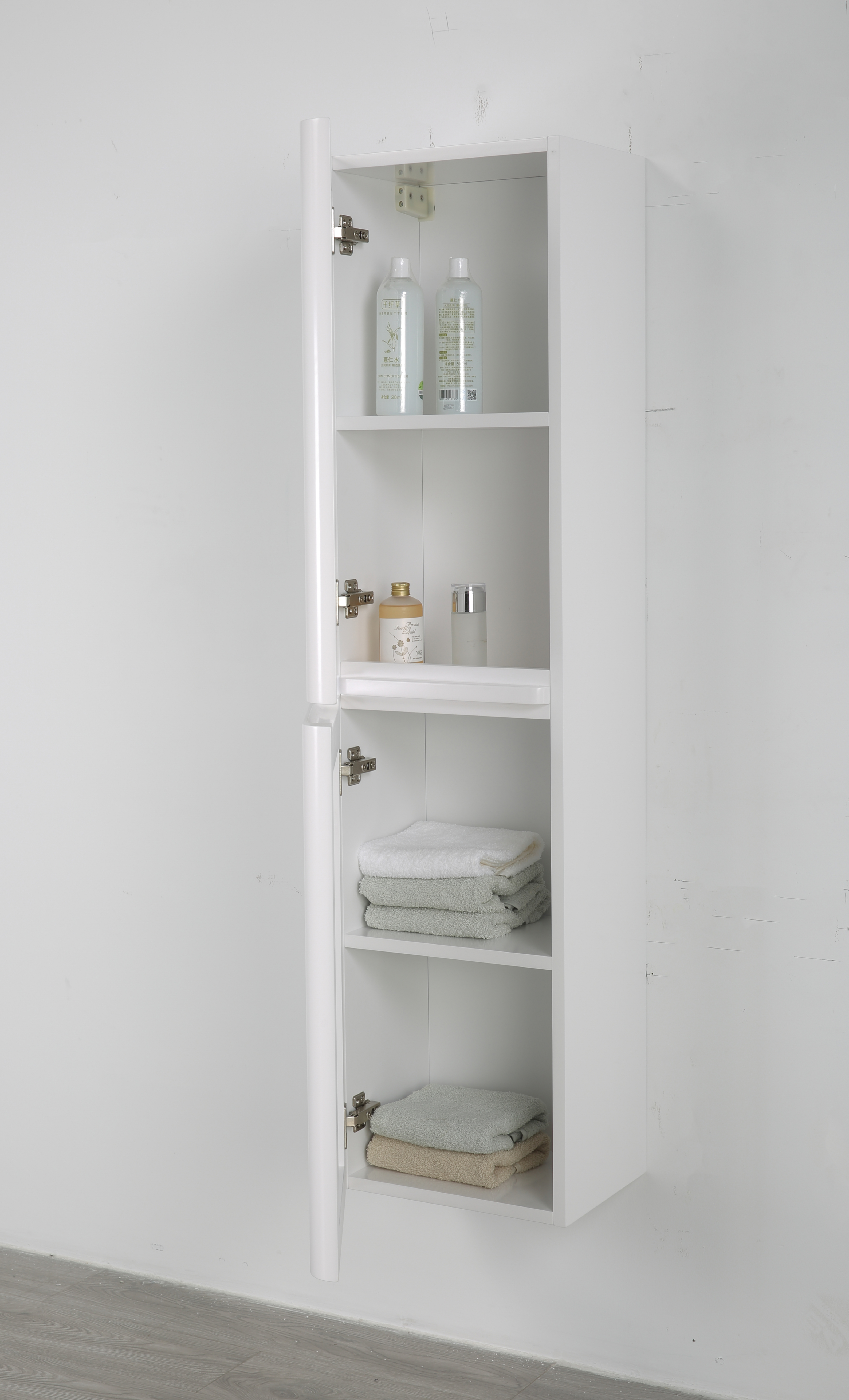 Der Hochschrank beeindruckt nicht nur durch Stil, sondern auch durch praktische Funktionen: Schranktüren mit flexibel wählbarem Türanschlag, zwei großzügige Ablageböden und die Soft-Close-Funktion für sanftes Schließen. Hochwertige Metallscharniere stehen für langanhaltende Qualität.