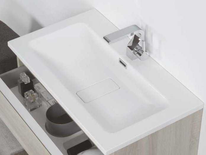 Das Design des Waschtischunterschrank zeichnet sich durch einen effizienten Stauraum aus: Ein Vollauszug mit hoher Tragfähigkeit und ein Schubkasten bieten ausreichend Platz für Ihre Badutensilien. Dank des komfortablen Selbsteinzugs mit Dämpfung schließen die Schubladen sanft und leise. Ein integrierter Griff erleichtert das Öffnen und Schließen der Schubfächer.
